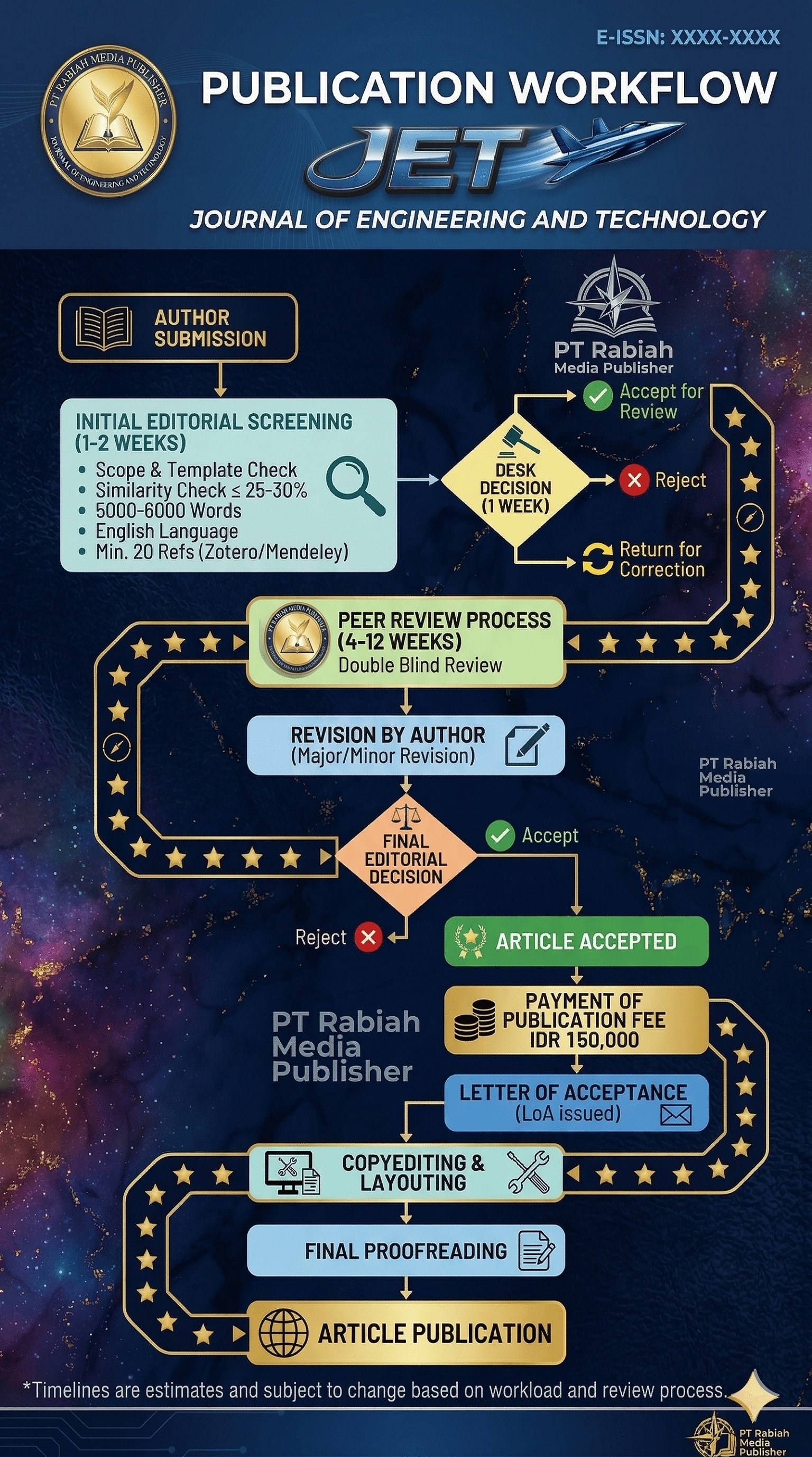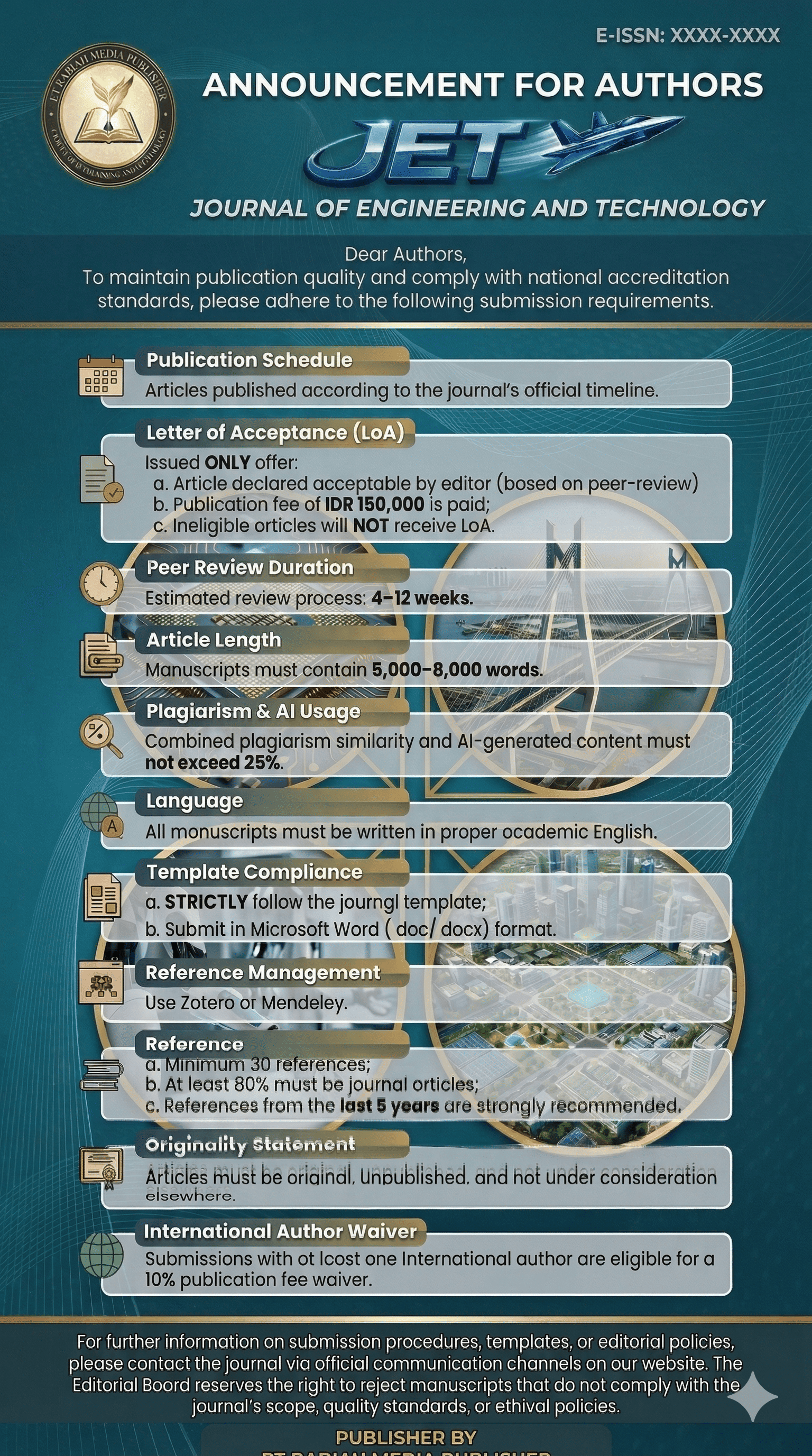 JET: Journal of Engineering and Technology is a peer-reviewed, open-access journal published biannually (April and October) by PT Rabiah Media Publisher in collaboration with ITBM Wakatobi. The journal publishes covers topics such as Mechanical and Civil Engineering, Electrical, Electronics, and Computer Engineering, Industrial and Manufacturing Engineering, Environmental and Sustainable Technologies, Information and Communication Technology (ICT) and Innovative Technologies and Emerging Fields. Each submitted manuscript undergoes a rigorous double-blind peer-review process and is evaluated by at least two expert reviewers.