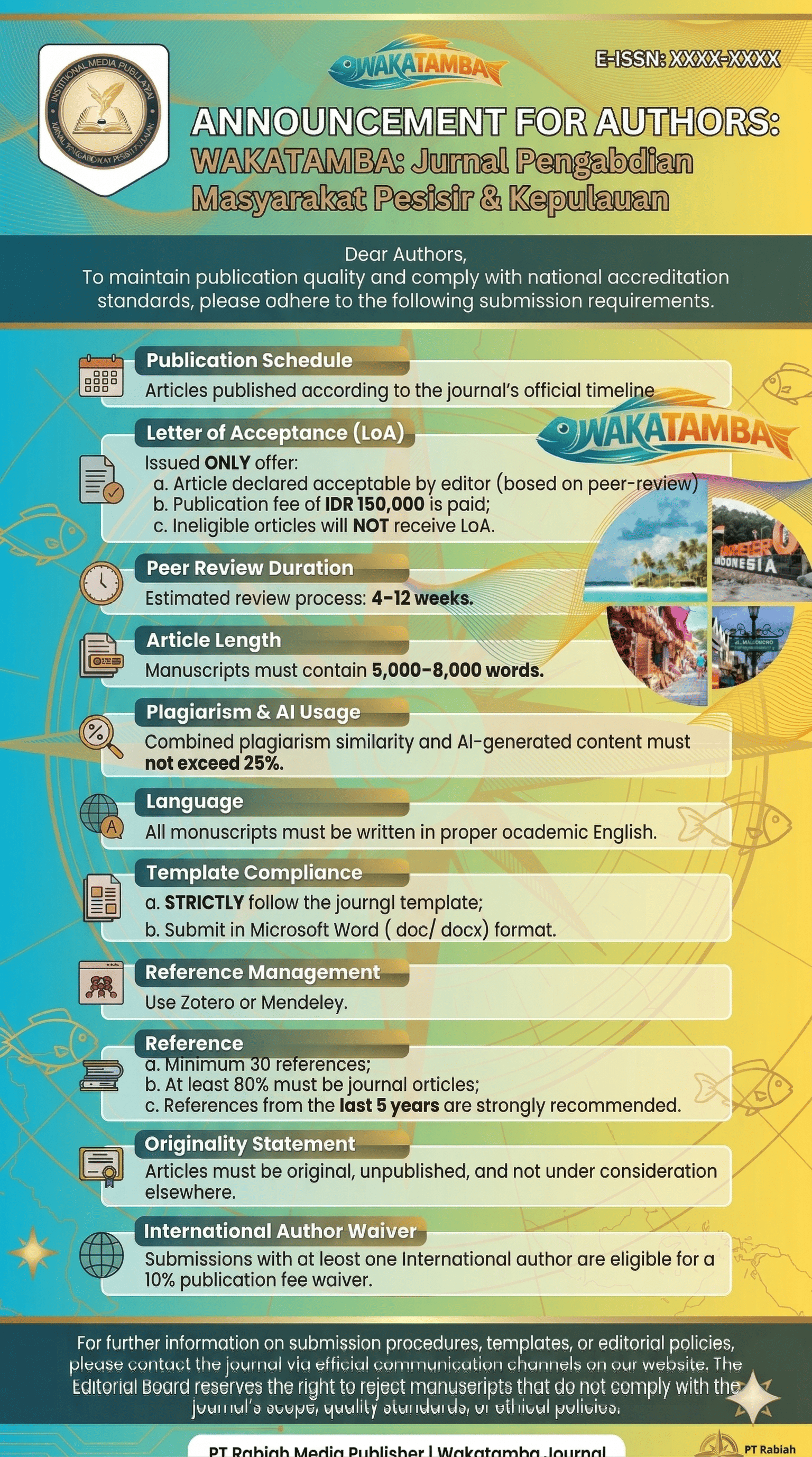 JOINT: Journal of Issues and National Thought is a peer-reviewed, open-access journal published biannually (April and October) by PT Rabiah Media Publisher in collaboration with ITBM Wakatobi. The journal publishes covers topics such as National Policy and Governance, National Identity and Civic Thought, Social and Cultural Issues, Law, Politics, and Public Affairs, National Development and Public Issues, Media, Communication, and Public Discourse. Each submitted manuscript undergoes a rigorous double-blind peer-review process and is evaluated by at least two expert reviewers.
